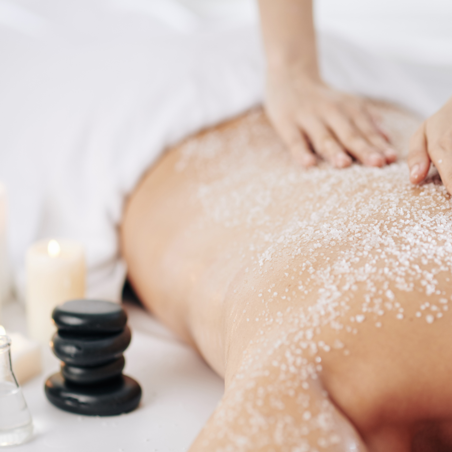 Ексфолиация с розов пясък и кварцови кристали. Енергизиращ масаж на крака и терапевтичен масаж на гръб.